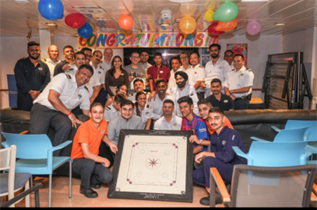 A thrilling Doubles Carrom tournment challenging a set of skills was conducted after some closely fought tensed matches, the Troply for the winners and the runner- up was presented by the Master in the Crew Day Room…. CONGRATULATIONS to the Winners and to all the team members who not only partiipated but also encouraged the players by cheering and advising !!